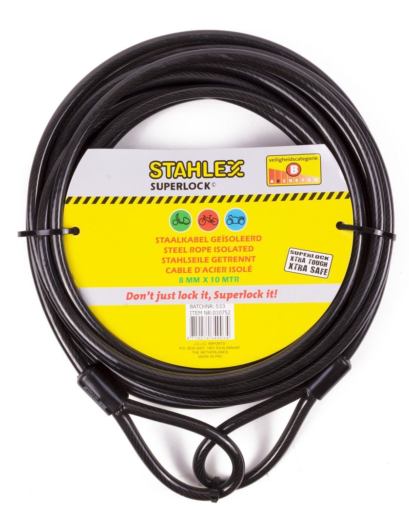 Deze staalkabel is niet alleen geschikt voor het beveiligen van fietsen en scooters, maar ook voor het vastzetten van gereedschap, ladders en andere voorwerpen. Dankzij de handige lengte van 10 mtr kun je de kabel eenvoudig bevestigen en strak aanspannen. Met een dikte van 8 mm is de kabel sterk genoeg om diefstal te voorkomen.